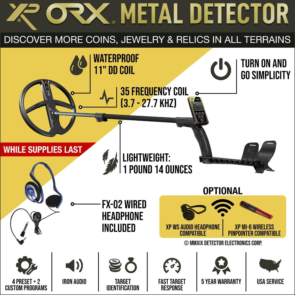 XP ORX Wireless Metal Detector with Back-lit Display + FX-02 Wired Backphone Headphones + 11" X35 Search Coil
