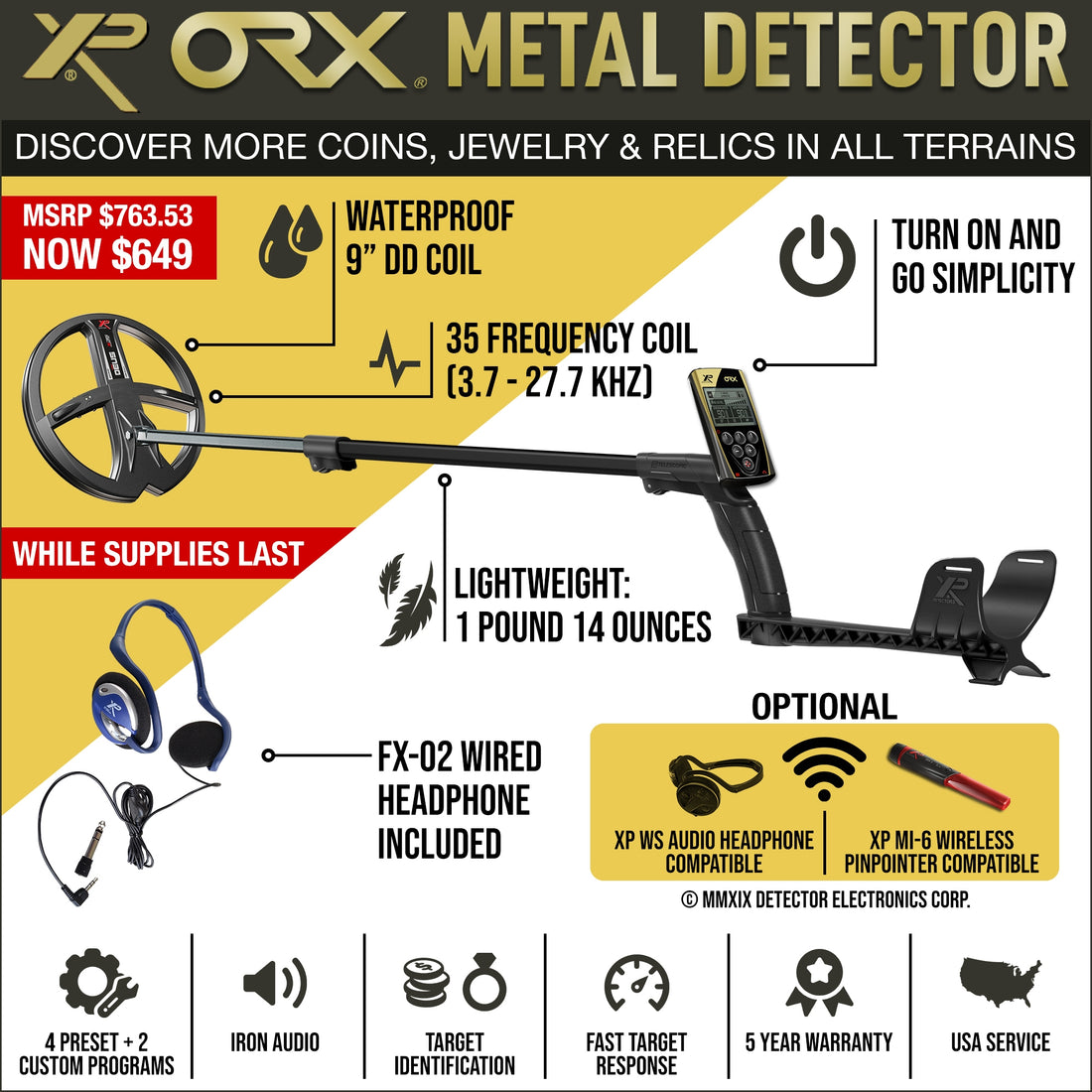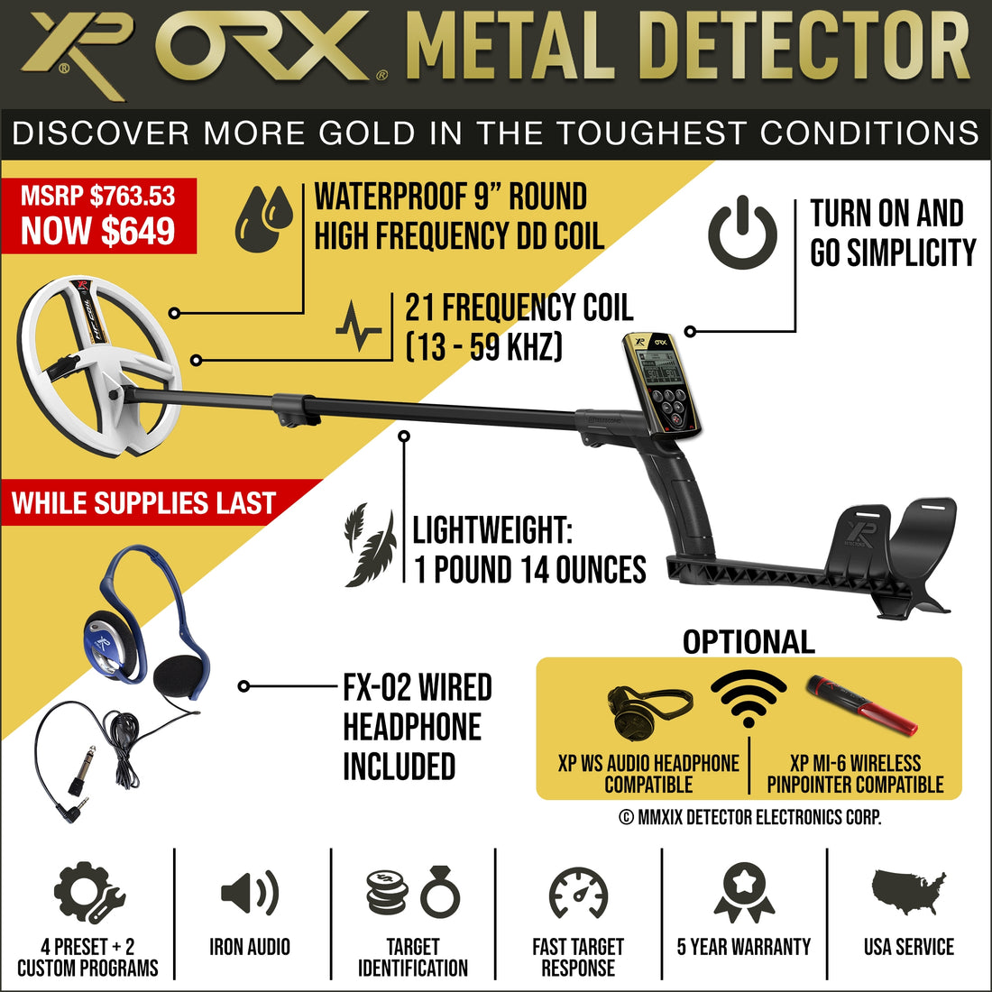 XP ORX Wireless Metal Detector with Back-lit Display + FX-02 Wired Backphone Headphones + 9" Round DD High Frequency Waterproof Coil