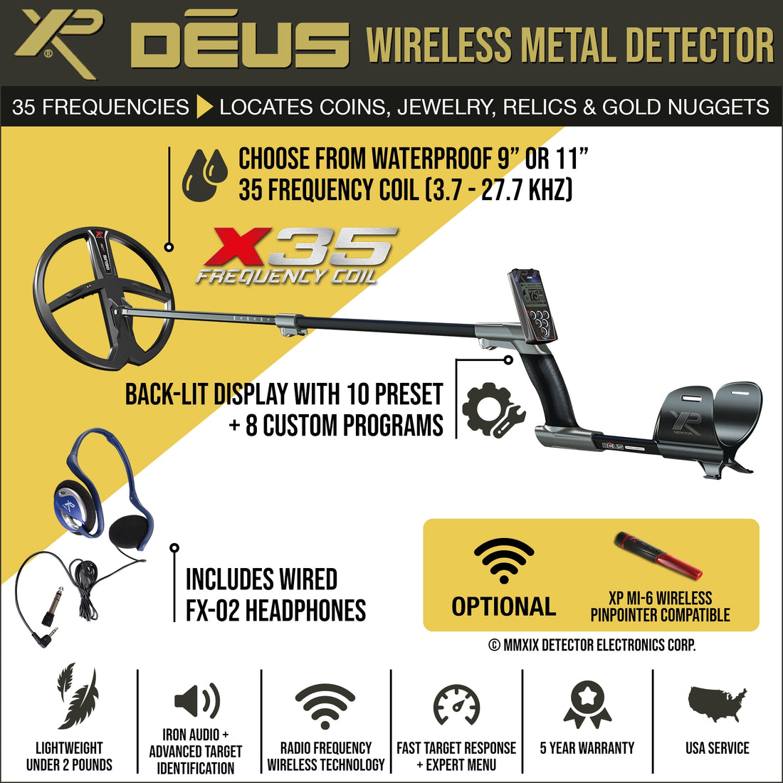 XP DEUS With FX-02 Wired Backphone Headphone + Remote + 9" OR 11" X35 Search Coil