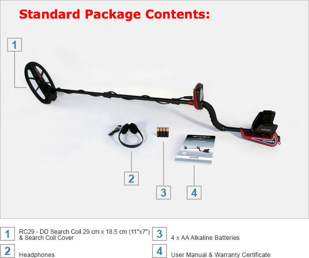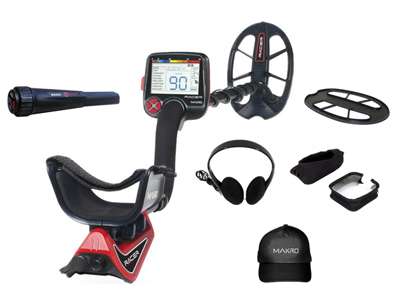 Configuration details: Makro Racer Standard Package. Two year parts and labor warranty. Includes RC29 - DD Search Coil 29cm x 18.5cm (11" x 7"), search coil cover and headphones. Developed for searching coins, jewelry and relics, the Makro Racer metal detector offers you the ideal combination of cutting-edge technology and advanced design. The Racer features a simple, easy-to-use menu design and includes four pre-set detecting modes of All Metal, Two Tone, Three Tone and Beach.