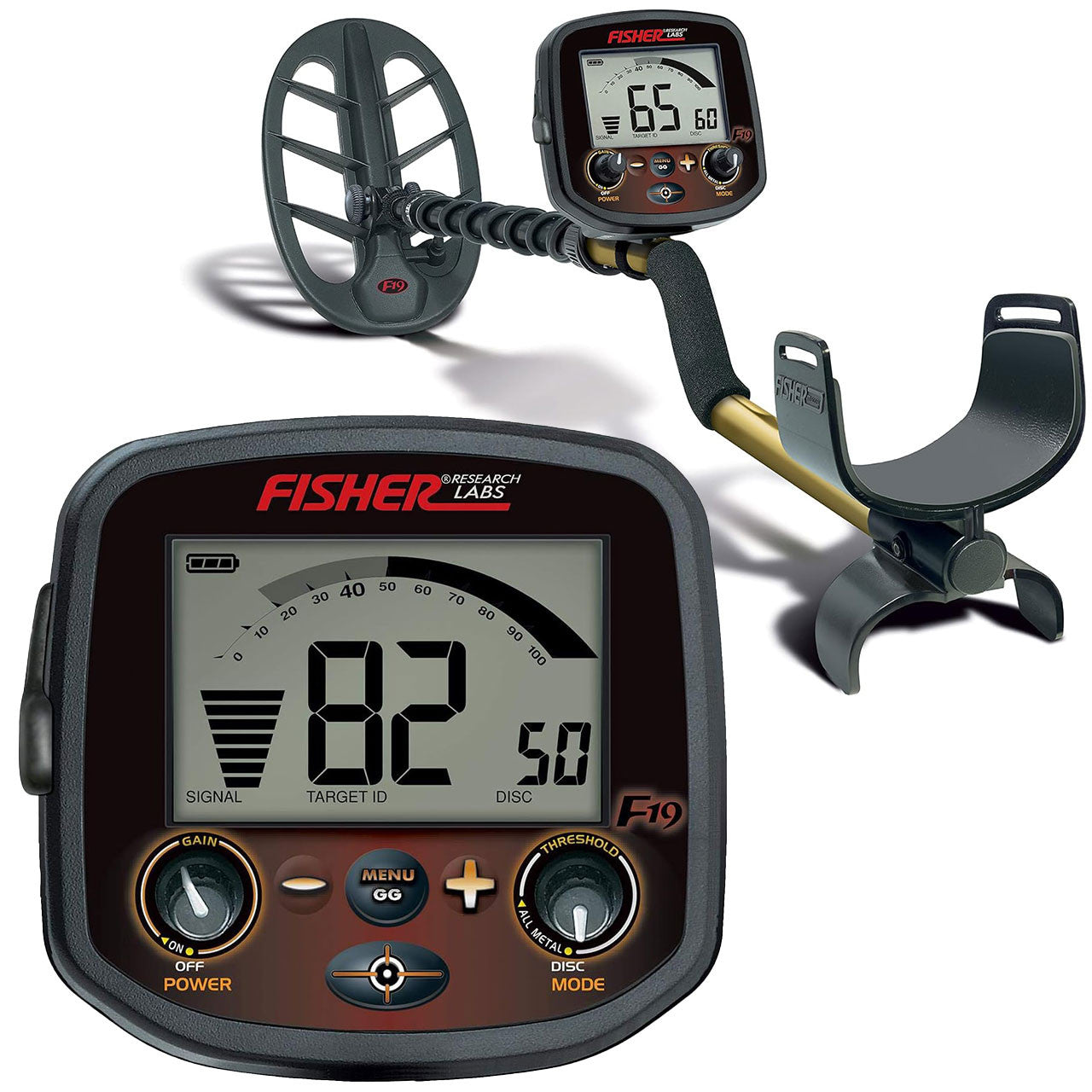 This Fisher high performance coin and relic metal detector comes standard with the 11" DD waterproof search coil. It operates at 19 kHz. If you are serious about relic hunting, you will quickly discover that the Fisher F-19 is one of the best relic hunting detectors ever! This model is available in black and gold color.