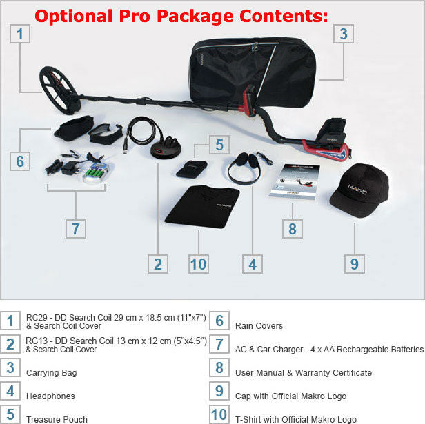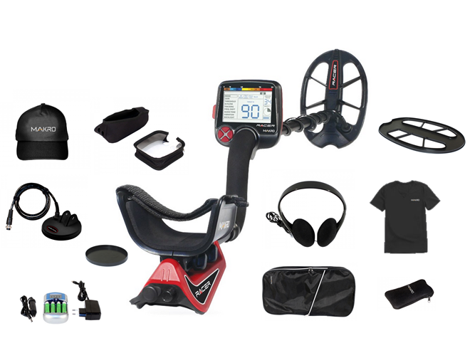 Configuration details: Makro Racer Pro Package. Two-year parts and labor warranty. Includes RC29 - DD Search Coil and Coil Cover 29cm x 18.5cm (11" x 7"), headphones, RC13 - DD Search Coil and Coil Cover 13cm x 12cm (5" x 4.5"), Carrying Bag, Headphones, Treasure Pouch, Rain Covers, AC & Car Charger - 4 x AA Rechargeable Batteries, User Manual & Warranty Certificate, Cap with Official Makro Logo, T-Shirt with Official Makro Logo. Developed for searching coins, jewelry, and relics, the Makro Racer metal detector offers you the ideal combination of cutting-edge technology and advanced design. The Racer features a simple, easy-to-use menu design and includes four pre-set detecting modes of All Metal, Two Tone, Three Tone, and Beach.