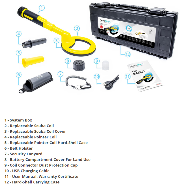 Nokta Makro PulseDive Scuba Detector and PinPointer 2-In-1 Set in Yellow. Whether you are a professional diver, a vacationer, or a detectorist who loves to search both on land and underwater, the PulseDive Hand-Held Metal Detector 2-in-1 Set in Yellow will be the best addition to your gear this year! Includes Hard Carrying Case, Coil Cover, Belt Holster, Security Lanyard, and USB Charging Cable.