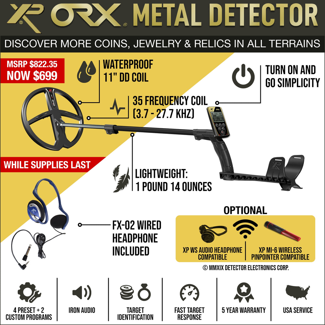 XP ORX Wireless Metal Detector with Back-lit Display + FX-02 Wired Backphone Headphones + 11" X35 Search Coil